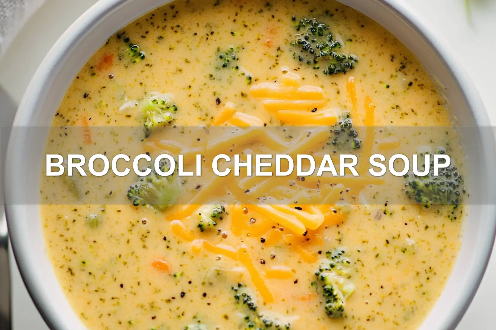 BROCCOLI CHEDDAR SOUP centered hero view, clean and uncluttered