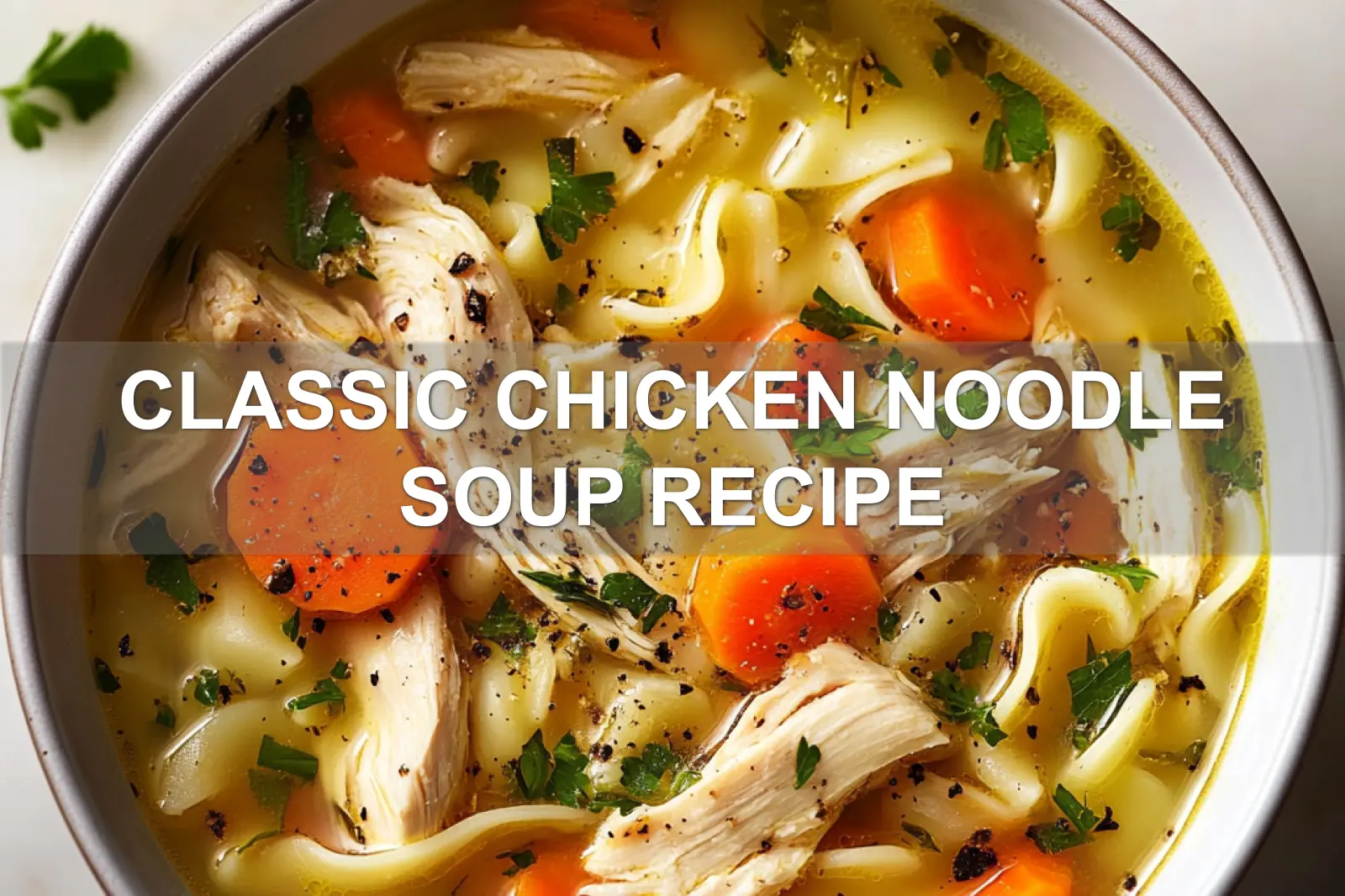 CLASSIC CHICKEN NOODLE SOUP RECIPE centered hero view, clean and uncluttered
